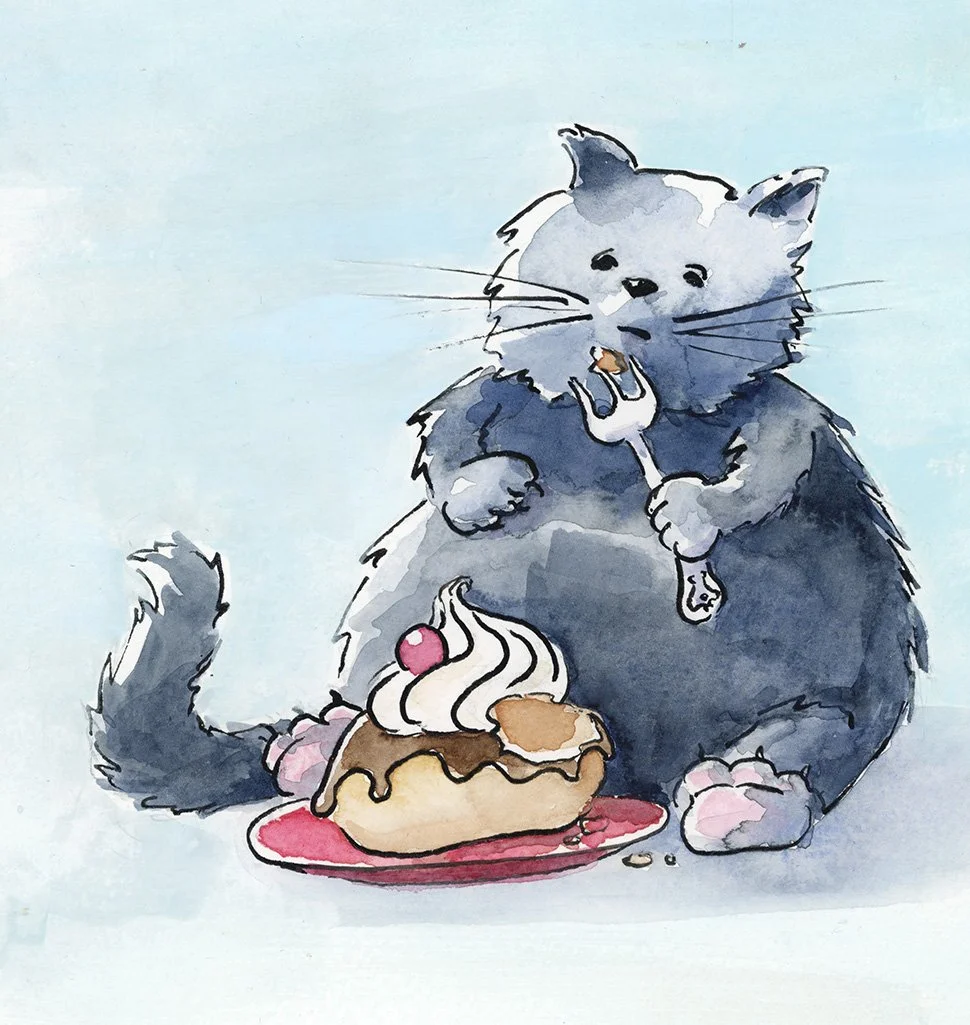 Sabine van der Ploeg · Kat eet taart, Aquarel, gouache en inkt op tekenpapier, 16.5 × 16.5 cm